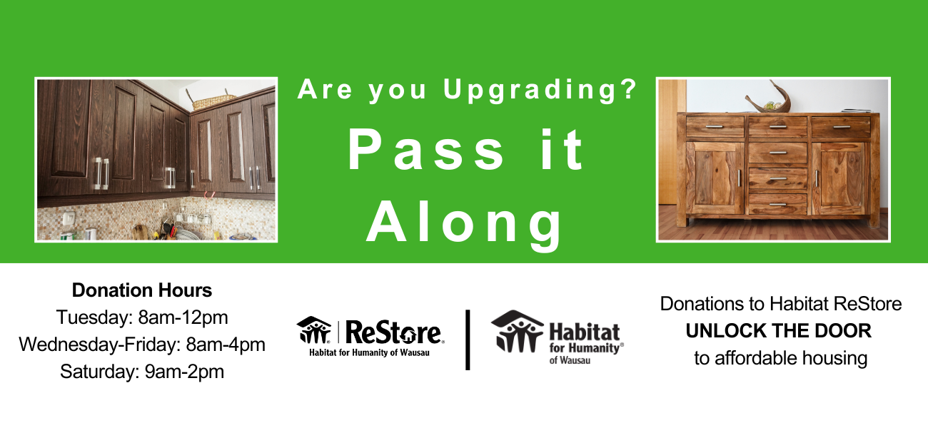 Wausau Habitat ReStore in Weston sells new and gently used items for the home including construction supplies, wood furniture, appliance, and tools. Proceeds from the ReStore fund Habitat Wausau programs to increase access to affordable housing and critical home repairs in the Greater Wausau area.
